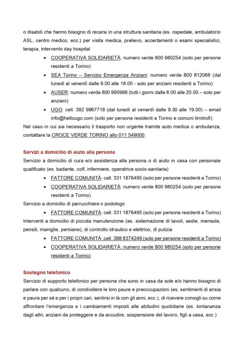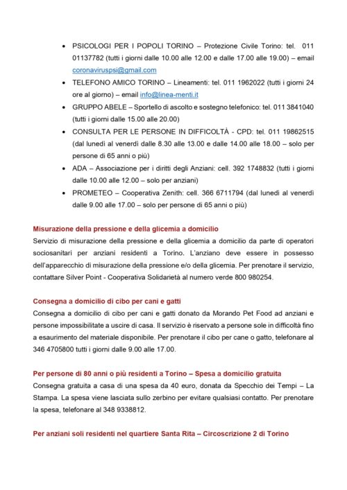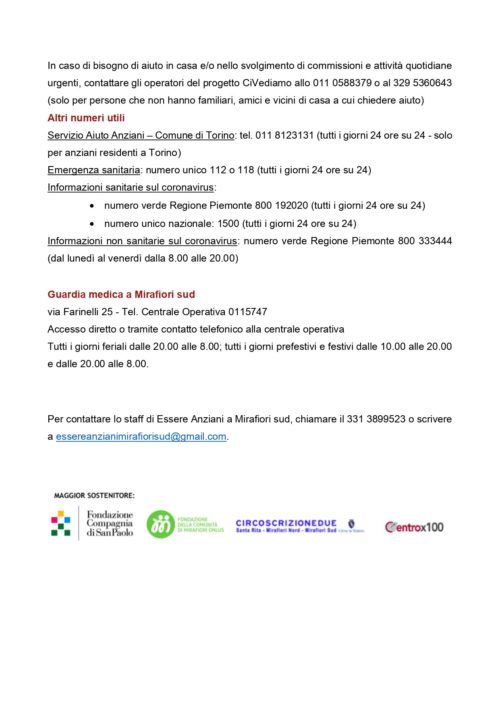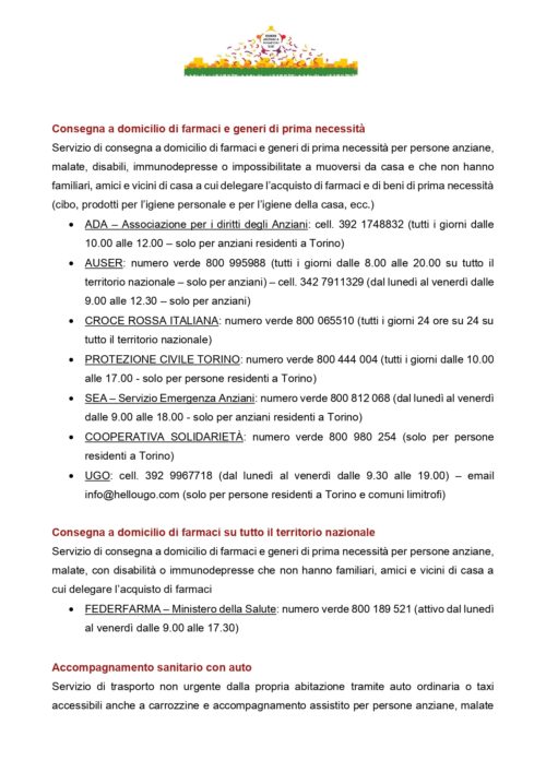 Apriamo la settimana condividendo con voi un documento realizzato da Essere Anziani a Mirafiori Sud (https://www.fondazionemirafiori.it/essereanziani). In esso troverete i numeri e i servizi utili a Torino durante l’emergenza, con una particolare attenzione ai bisogni degli anziani. In particolare vi sono raccolti i contatti per la consegna di spesa e farmaci a casa, l’accompagnamento sanitario con auto, i servizi vari a domicilio (come la misurazione della pressione e della glicemia), il sostegno telefonico, la consegna cibo per animali domestici, eccetera.